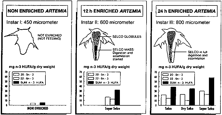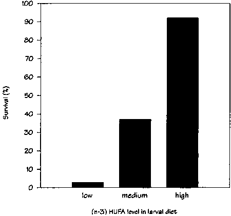 The variability of the nutritional value of Artemia nauplii as a food source for marine fish larvae has been well documented. As mentioned previously, the application of HUFA enrichment of the Artemia diet has been found to have a significant effect in marine fish larviculture, and has generally resulted in increased survival and reduced variability in fish hatchery production. The latter is particularly important since it was the missing link in the development of commercial production. Furthermore, the quality of the fry in terms of stress resistance, better pigmentation, reduced deformities, better swimbladder inflation, and increased vigor, appears to have been directly correlated with the (n-3) HUFA enrichment of their larval diet.