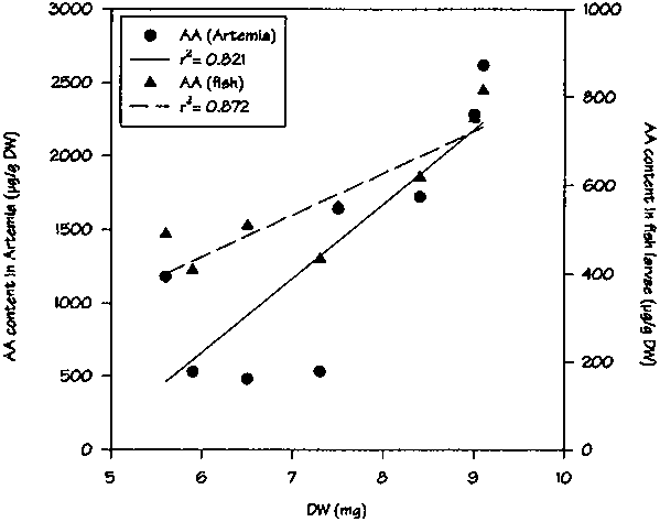 Moreover, African catfish (Clarias gariepinus) larvae have been found to perform significantly better when fed an Artemia diet as compared to co-feeding with Artemia and a semi-purified diet (ratio 80:20). Dietary supplementation with ascorbate in the form of vitamin C-boosted Artemia, was also found to have a significantly positive effect on the growth of catfish larvae one week after first-feeding; the evaluation of the physiological condition of the larvae showing significantly higher resistance with increasing dietary vitamin C concentration (Fig. 4.3.16).