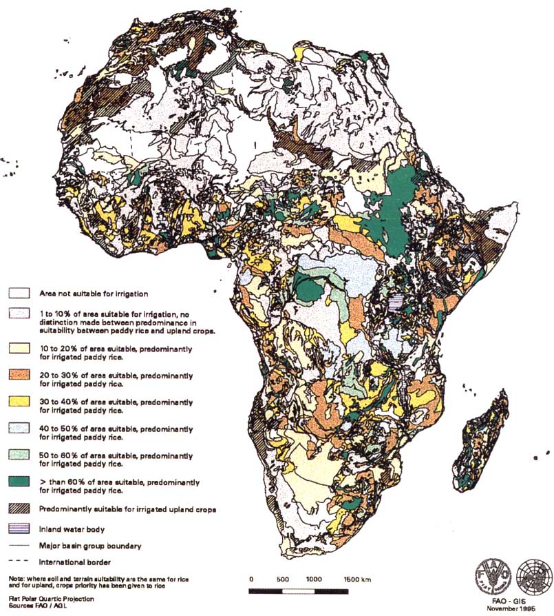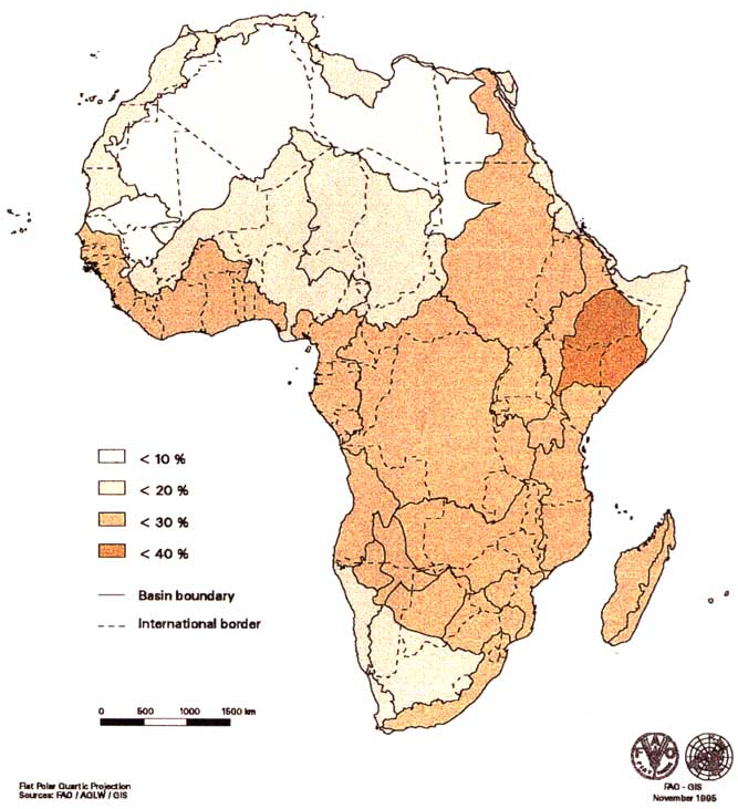 Figure 3 shows the detailed map of soil and terrain suitability for surface irrigation per type of crop as a result of the above methodology. Tables 4 and 5 give the extent of suitable land for both types of crops per major basin group and per country respectively. Figure 4 shows the total area of land (rice plus upland crops) suitable for surface irrigation as a percentage of the total area of each of the 24 major basin groups, Figure 5 as a percentage of the area of each of the 53 African countries. As the figures show, the land in the northern part and the southern desert zones is less suitable for surface irrigation than in the rest of Africa.