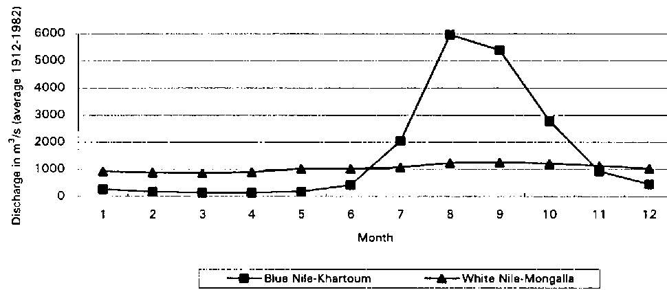 The Nile River, with an estimated length of over 6800 km, is the longest river flowing from south to north over 35 degrees of latitude. It is fed by two main river systems: the White Nile, with its sources on the Equatorial Lake Plateau (Burundi, Rwanda, Tanzania, Kenya, Zaire and Uganda), and the Blue Nile, with its sources in the Ethiopian highlands. The sources are located in humid regions, with an average rainfall of over 1000 mm per year. The arid region starts in Sudan, the largest country of Africa, which can be divided into three rainfall zones: the extreme south of the country where rainfall ranges from 1200 to 1500 mm per year; the fertile clay-plains where 400 to 800 mm of rain falls annually; and the desert northern third of the country where rainfall averages only 20 mm per year. Further north, in Egypt, precipitation falls to less than 20 mm per year.