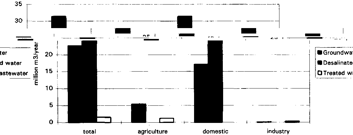 Total water withdrawal, was estimated at 55.68 million m³ in 1995, of which 87% for domestic purposes (Figure 1). Of the total quantity of groundwater used (22.72 million m³), 17.20 million m³ were used for domestic purposes, 5.41 million m³ for agricultural and the remaining 0.11 million m³ for industrial purposes. The desalinated water (31.40 million m³) was all used for the provision of potable water in the public supply, which is equal to 65% of the total potable water supply. Of the total reused treated wastewater (1.56 million m³); 1.22 million m³ was reused in agriculture and 0.34 million m³ in industry (Figure 2).