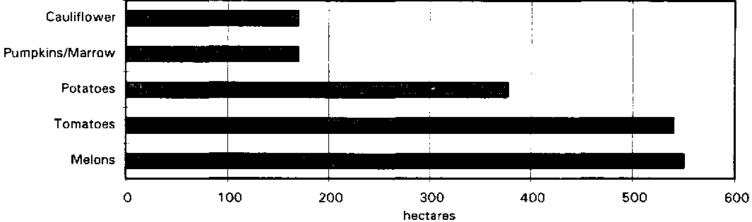 The major crops under full or partial control irrigation are melons, tomatoes, potatoes, pumpkins! marrow and cauliflower (Figure 5), with a total cropped area of 1 807 ha (average cropping intensity is 2.5). In addition, the areas benefiting from water harvesting techniques (1953 ha) are generally cropped once a year. With the introduction of micro-irrigation and improved farming practices, the yields of some products significantly increased during the period 1990-95. Yields of melons increased from 6 tons/ha in 1990 to an estimated 20 tons/ha in 1995.