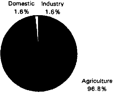 Total water withdrawal in 1991 was estimated at 156 km³, of which 97% for agricultural purposes. (Figure 1). Groundwater abstraction for agriculture has been roughly estimated at 55 km³/year, which is approximately the volume of groundwater renewable resources. However, in some areas, development appears to have reached the point where groundwater is being mined. Most urban and rural water is supplied from groundwater. Over 50% of the village water supply is obtained through hand pumps installed by private households. In saline groundwater areas, irrigation canals are the main source of domestic water.