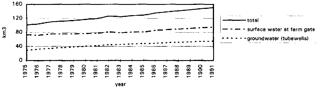 Over the past 20 years, groundwater use has been a major factor in increasing agricultural production. Groundwater tubewells not only supply additional water but have provided flexibility to match surface water supplies with crop water requirements. However, because of uncontrolled and rapid private sector development of groundwater (6% annual growth), there is a danger of excessive lowering of water tables and intrusion of saline water into freshwater aquifers. Within the IBIS, total water availability at the farm gate has significantly increased in the last 15 years (Figure 7), and changed slightly in its composition, with a higher use of groundwater extracted by tubewells. In 1975, surface water represented 70% of the total water available, groundwater provided through private tubewells 22.5% and groundwater provided through public tubewells 7.5%. In 1990, the figures were 63%, 27% and 10% respectively.