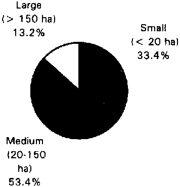 There are no national criteria for distinguishing between the size of the schemes. The classification of registered farms and agricultural projects according to equipped areas assumes that small schemes work areas less than 20 ha, covering 33% of the total equipped area, medium size schemes work areas between 20 and 150 ha, covering 54% of the total area, and large schemes work areas of over 150 ha, covering 13 % of the total area (Figure 4).
