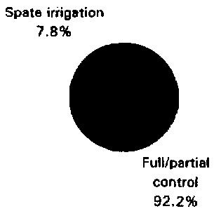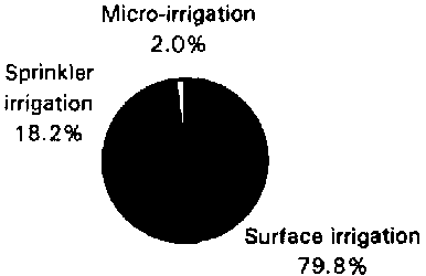 The area equipped for full or partial control irrigation can be divided into 52 000 ha of complementary irrigation and 303 000 ha of socalled intensive irrigation (Figure 3). Surface irrigation techniques are mainly practiced on the schemes with complementary irrigation and some sprinkler irrigation is used on cereals in case of a severe rainfall deficit and on fruit trees during the early years of their development. The intensive irrigation schemes can be divided into (Figure 4):