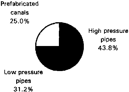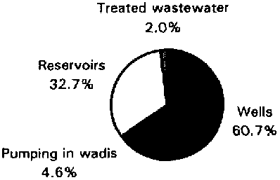 The communal irrigation water distribution systems are in general modern. There are prefabricated canals or low pressure pipes for surface irrigation and high pressure pipes for sprinkler irrigation (Figure 5). Surface irrigation remains the most important irrigation technique (Figure 6). At present, about 6 000 ha are irrigated by treated wastewater, the remaining part by surface water (dams, pumping in wadis) and by groundwater (open wells, tube-wells) (Figure 7).