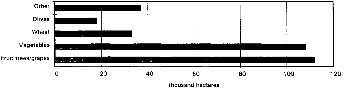 Fruit trees (dates, oranges, grapes, etc.) and vegetables (tomatoes, melons, water melons, potatoes, etc.) are cultivated on about 70% of the full or partial control schemes actually irrigated. However, recent government encouragement for the development of dairy livestock has led to an increase in the irrigation of cereals and fodder crops. The irrigation sector contributes about 3035% to the agricultural value of the country. In 1992, about 308 000 ha were actually irrigated and harvested, which is 80% of the water managed area of 385 000 ha (Figure 9).