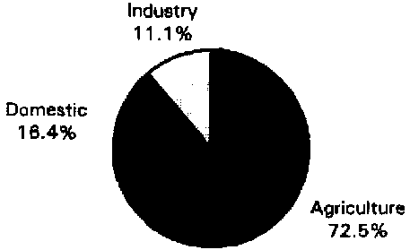 It is estimated that 95 km³ of the total surface runoff of 192.8 km³/year could be technically developed for economic use. In 1992, total annual water withdrawal was 31.6 km³, of which agricultural use accounted for 72% (Figure 1). About 24% of total water withdrawal, or 7.6 km³, was estimated to be groundwater, of which 3.7 km³ for agricultural purposes. Almost 98% of the urban and 85% of the rural populations have access to safe drinking water. The treatment of domestic wastewater is estimated at 0.1 km³/year.
