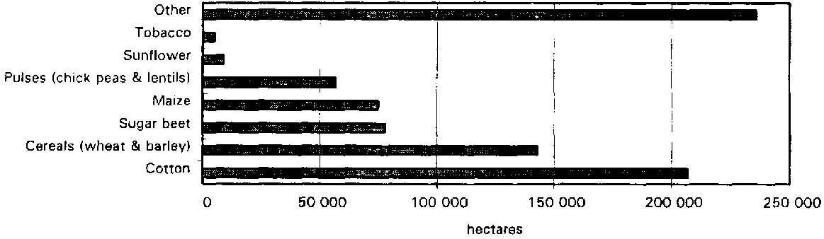 The average yield for irrigated cereals (wheat and barley) was 4.1 t/ha as against 2.1 t/ha for rainfed crops. For irrigated pulses (chick peas and lentils) the average yield was 2.5 t/ha, for cotton 2.9, for sunflowers 2.3, for maize 7.9, for sugar beet 55.2 and for tobacco 1.1 t/ha.