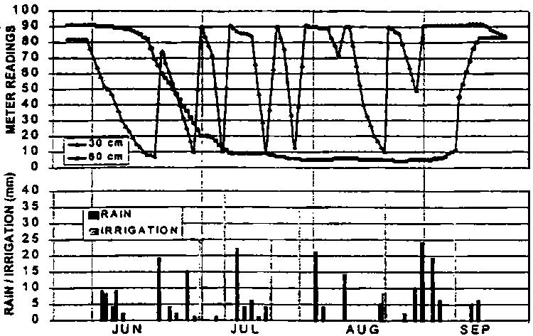 In practical irrigation scheduling, gypsum block readings at this depth should fall to 5-10 points (depending on the block type, see Figure 1) before irrigation is started. Following this instruction, irrigation may not be necessary to achieve economic yields on deep soils with high water storage and frequent rains. This is shown in Figure 3 where the readings of the gypsum blocks at 30 cm depth of an irrigated and a non-irrigated experimental field are compared.