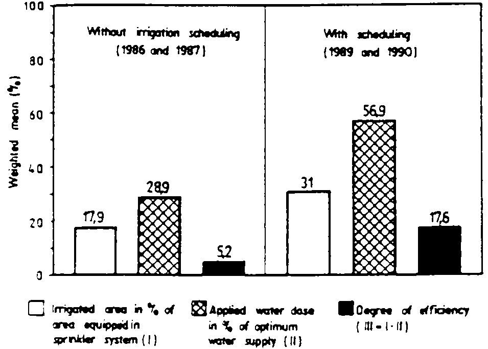 The results presented here indicate that the degree of use of the large-scale irrigation system in the period 1986-1990 was far from the optimum. It is evident that irrigation scheduling contributed to increasing the area irrigated and to improving the ratio of actual to optimal water applications.
