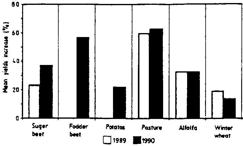 The irrigated area increased on average from 18% to 31%, and the use of the optimum depth rose on average from 29% to 57%. As a result, the index which for the period before the scheduled irrigation (1986-1987) was on average only 5 %, increased in the scheduled irrigation period (1989-1990) to 18%, a more than threefold increase. Figure 4 shows the values of mean yield increase in the years 1989 and 1990, and the increments in percent.