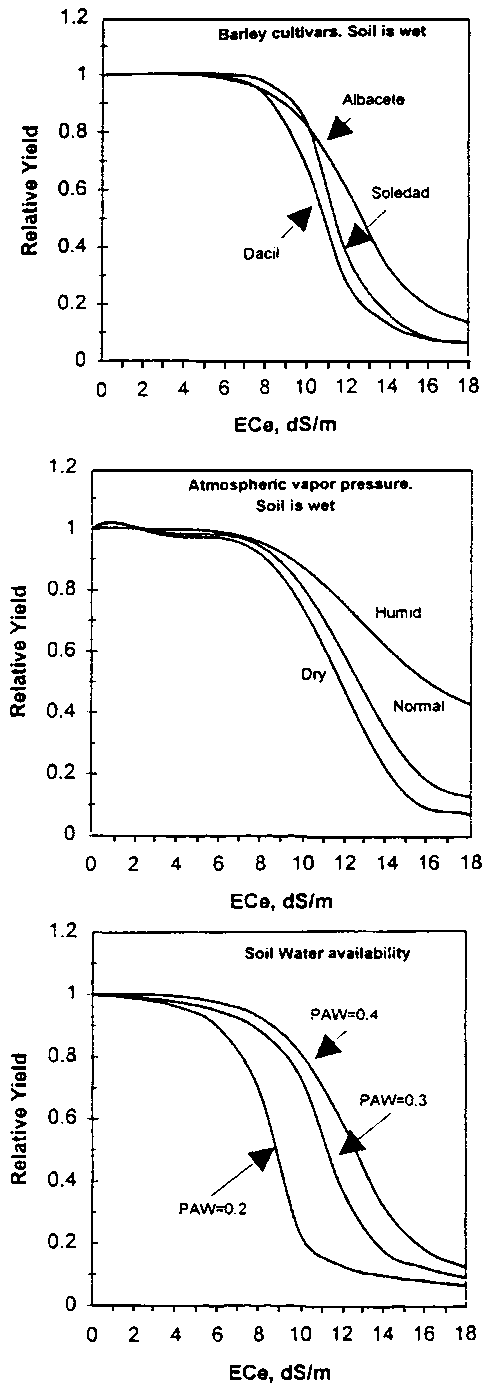 Many authors report the decrease of crop salt tolerance as the atmosphere becomes drier and soil water availability decreases (Francois and Maas, 1993. Hoffman et al., 1990). Salt tolerance data for many crops is available in literature (Francois and Maas, 1993). However, the applicability of this data to field conditions may be restricted (Bresler and Hoffman, 1984). A sensitivity analysis was performed to evaluate the model's ability to account for fluctuations of these factors (Figure 1). Relative yield of three barley cultivars follow their order of crop salt tolerance. As the value of the parameter p increased, the slope of the relative yield response function increased, and as y 50 increased, the threshold beyond which the relative yield started to decreased was higher. When the environment becomes drier, the model simulated less tolerance to soil salinity, consistent with field observations (Francois and Maas, 1993). Any factor affecting atmospheric evaporative demand (e.g., temperature) will produce a similar response. Finally, the model predicted larger crop salt sensitivity as soil water decreased.