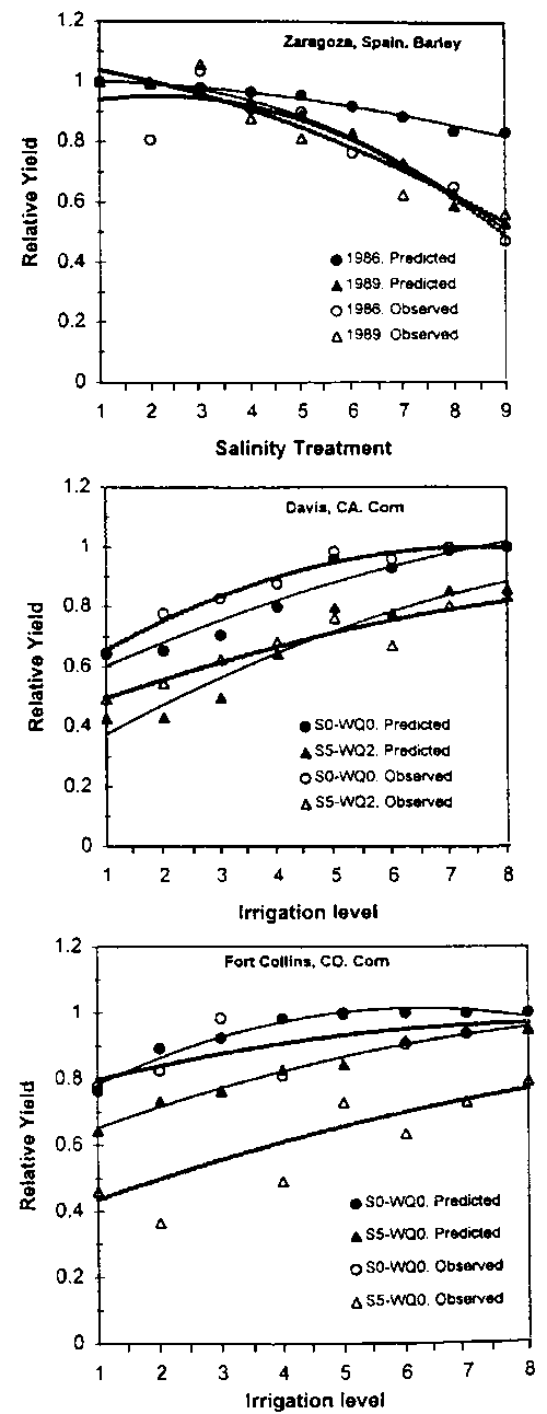 Figure 2. Observed and predicted relative yields. At Zaragoza, salinity of the irrigation water increases from treatment 1 to 9. At Davis and Fort Collins, the amount of water applied increased from level 1 to 8. S0 and S5 refer to non-saline and saline plots at pre-planting, and WQ0 and WQ2 refer to non-saline and saline applied water, respectively.
