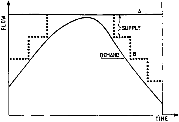 Around the middle of this century a period started where design and operation were increasingly determined by scientific methods and techniques. This scientific approach was based on production objectives: optimization of yields and efficiencies. Soil-water-plant relationship became the focus. As a result of extensive research into this relationship, water requirements for crops at various growth stages under different climatic and soil conditions could be determined with great accuracy (see FAO, 1977; 1979). This development enabled designers/planners to better assess required canal capacities, irrigable areas, required reservoir volumes, etc., on the basis of assumed cropping patterns. Agency managers/ operators were able to set up irrigation schedules on the basis of actual cropping patterns (demand-based operation), or previous or assumed cropping patterns (supply-based operation). The possibility to accurately assess crop water requirements during the growing season, together with efficiency considerations, led to irrigation schedules (supply curves) which follow closely the actual or assumed demand curves (Figure 1).
