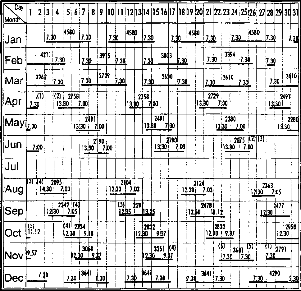 The flow rating curve of the flume at Rama Gil intake was measured. Every day when water was delivered into the secondary canal, the flow (through gauge reading) and time were recorded. Figure 2 shows the timetable of flows delivered during 1994. For each delivery, opportunity initial and ending time, and mean flow (l/s) are indicated.
