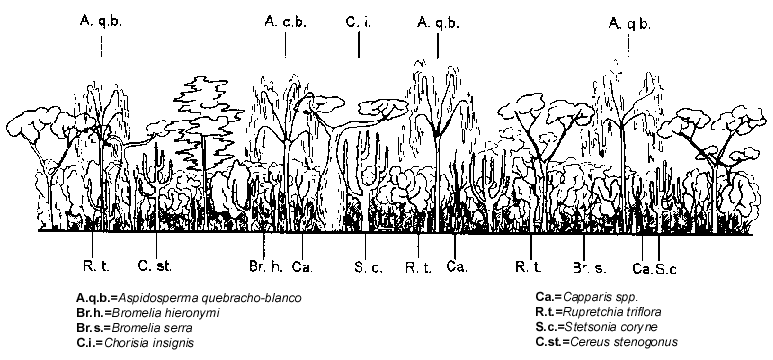 * La forêt xéromorphe (Quebrachal d'Aspidosperma quebracho-blanco), formation climacique qui couvre la majeure partie du chaco sec, se caractérise donc par les strates précédemment décrites dont les espèces prépondérantes sont: Aspidosperma quebracho-blanco, Chorisia insignis, Cereus stenogonus, Stetsonia coryne, Schinopsis quebracho-colorado, Castela coccinea, Prosopis kuntzei, Bulnesia sarmientoi, Cercidium praecox, Capparis tweediana, C. retusa, C speciosa, Bougainvillea praecox, Ziziphus mistol, Caesalpinia paraguariensis,... (Spichiger et al., 1991).