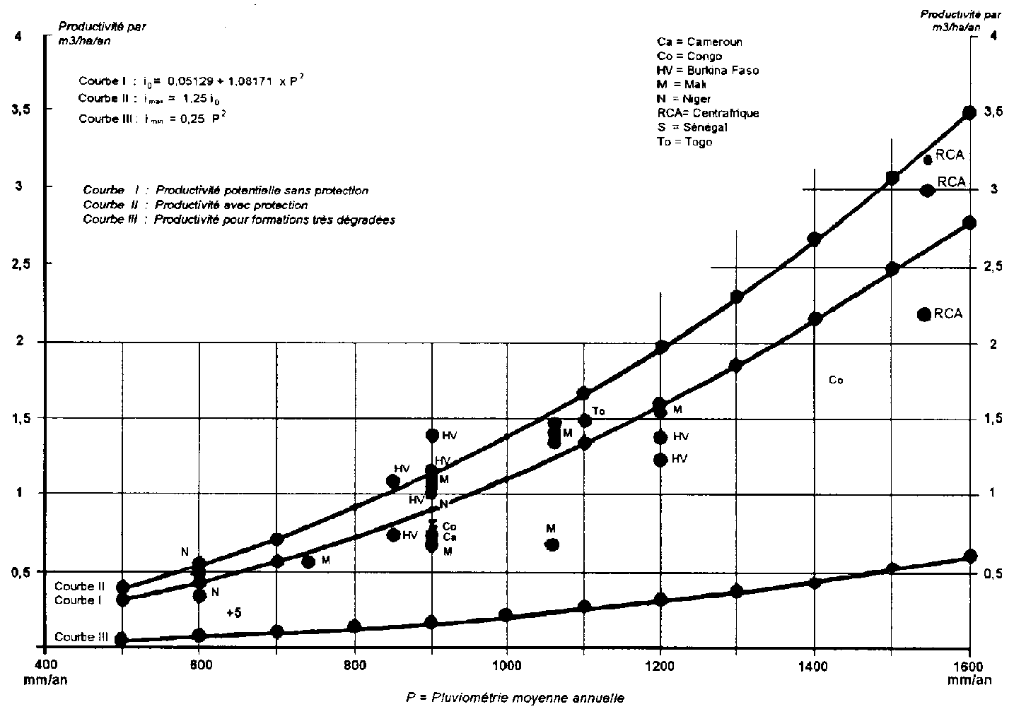 Ce graphique fait encore référence aujourd'hui dans le monde forestier africain des zones tropicales sèches. Lors de la mise en aménagement de forêts au Burkina Faso dans les années 90, il a servi de base à l'évaluation des productivités. Il en va de même pour les estimations de projets au Niger. Ces productivités correspondent à une découpe supérieure à 10 cm de circonférence.