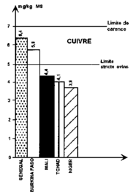 Les résultats de l'analyse fourragère renseignent donc sur la valeur du pâturage Ils informent, selon la période de l'année, sur les éventuels déficits de matières azotées et de valeur énergétique Des analyses plus fines donnent les valeurs des oligo-éléments et font apparaître des carences (figure n° 12) locales ou générales (Guérin et al., 1994). En effet, le principal facteur limitant de la nutrition minérale du cheptel tropical est le phosphore. Les teneurs en phosphore des fourrages dépassent rarement 2 g/kg MS; les graminées annuelles des parcours sahéliens sont les plus pauvres. Les graminées vivaces peuvent produire en saison sèche, après le passage d'un feu ou le pâturage, des repousses contenant jusqu'à 3 g de P/kg MS, mais cette teneur diminue pendant la croissance des plantes (de 0,1 g/kg MS par semaine d'âge). La teneur en phosphore des régimes des ruminants est améliorée par la consommation de dicotylédones herbacées ou ligneuses, mais faiblement Les teneurs en cuivre sont supérieures ou égales à la limite de carence dans les fourrages verts herbacés ou ligneux, mais inférieures à celles-ci dans les pailles. Celles en zinc sont le plus souvent inférieures à la limite de carence, mais parfois supérieures pour quelques espèces ligneuses En conséquence, les teneurs en zinc des rations peuvent être acceptables à certaines périodes, alors que l'analyse de la strate herbacée fait suspecter des risques de carences Le faible niveau d'apport de ces deux éléments est une constante de l'Afrique intertropicale, mais le risque de carence est plus ou moins aigu suivant les pays et les régions, y compris à l'intérieur d'une zone climatique donnée