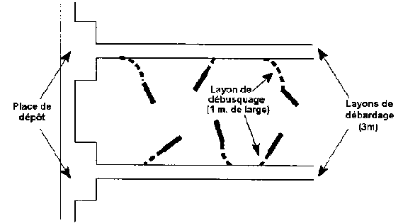 - une infrastructure non systématique, en fonction du bois abattu avec des layons d'axe à ouvrir pour chaque arbre. Un layon peut atteindre plusieurs arbres par zigzag. Les obstacles sont contournés et les layons sont moins longs, si le parcours entre les grumes est bien choisi. Ce dernier type de réseau est le plus adapté au débardage attelé.
