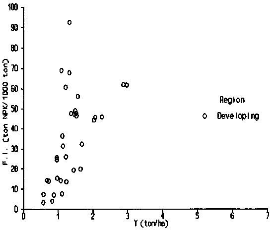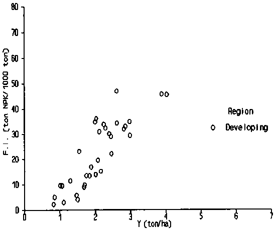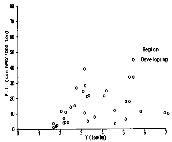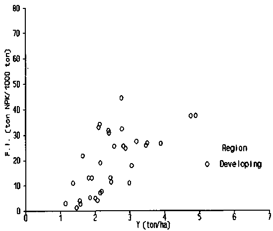 Relationship between overall yield (Y) and fertilizer intensity (FI) for seven regions covering all the developing countries for 1961/63,1969/71,1979/81,1988/90 and 1989/91; Data represent