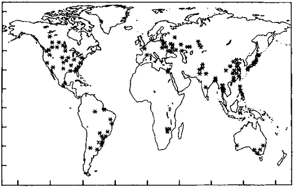 The IBSNAT crop models were used to estimate how climate change and increasing levels of carbon dioxide may alter yields of world crops at 112 sites in 18 countries. (Figure 9.1). The crop models used were CERES-Wheat (Ritchie and Otter, 1985; Godwin et al., 1989), CERES-Maize (Jones and Kiniry, 1986; Ritchie et al., 1989), CERES-Rice (Godwin et al., 1993) and SOYGRO (Jones et al., 1989).