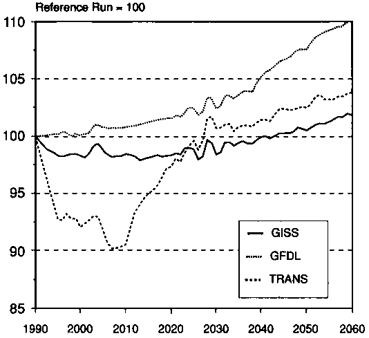 Figure 9.5. Impact of climate change on cereal commodities, year 2060, with physiological effects of 555 ppm CO2 and farm-level Adjustment 1 impacts decreases with the magnitude of the impact. Economic adaptation can largely compensate for moderate yield changes such as the GISS and GFDL scenarios, but not greater ones such as the UKMO scenario.