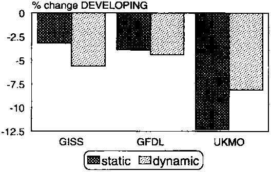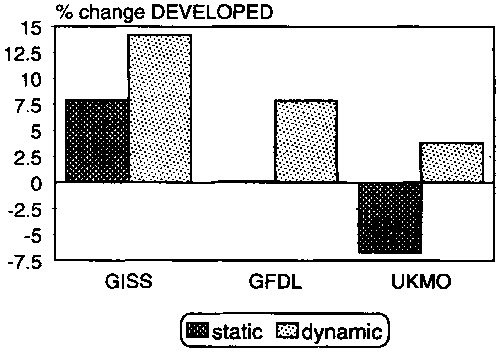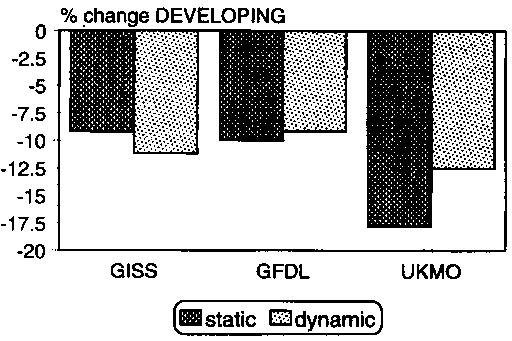 In all climate change scenarios, relative productivity of agriculture changes in favour of developed countries, with implications on resource allocation. Economic feedback mechanisms are likely to emphasize and accentuate the uneven distribution of climate change impacts across the world, resulting in net gains for developed countries in all but the UKMO scenarios and a noticeable loss to developing countries. As a result, net imports of cereals into developing countries increase in all scenarios, on the order of 20 to 50% compared to trade in the reference scenario.