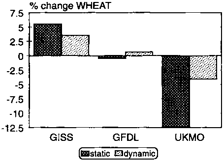 The magnitude of the impacts and these different responses at aggregate regional level are shown in Figure 9.3 and Figure 9.4, for cereals and total crops, respectively. Figure 9.5 illustrates the impacts projected by cereal commodity (with physiological effects of 555 ppm CO2 and farm-level adaptation). Accordingly, global wheat production is less likely to suffer negative climate impacts than other cereal commodities; it increases in GISS and GFDL scenarios and declines less than other cereals in the UKMO scenario. This is likely due to the location of major wheat-producing regions at mid and high latitudes, where yield declines are projected to be lower.