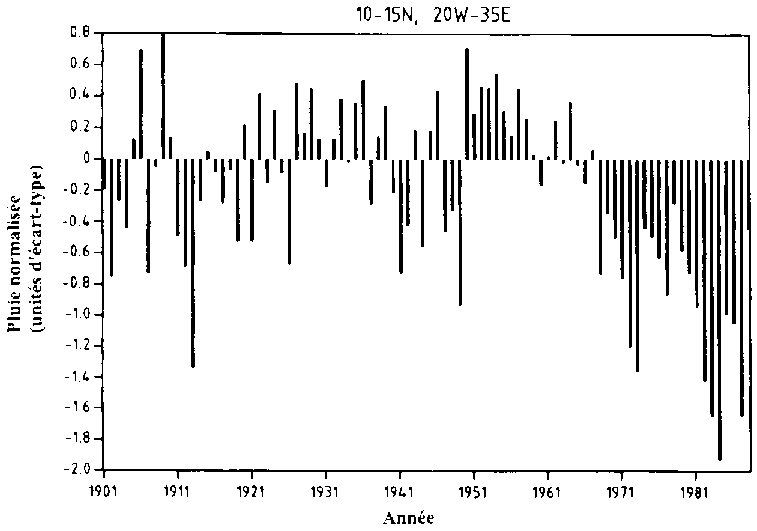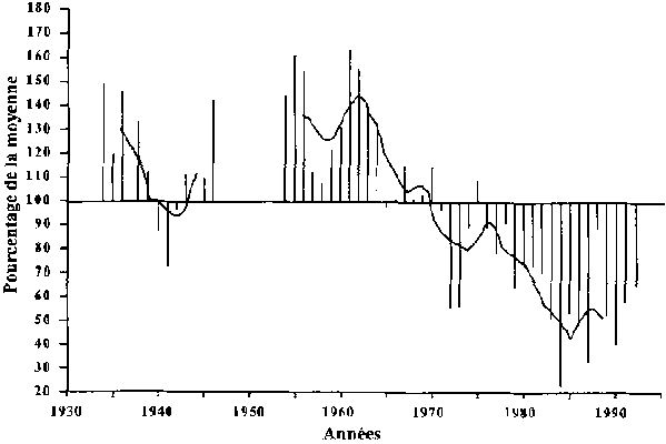 Dans la première approche, la variabilité naturelle du climat est utilisée pour prédire les tendances de précipitations pendant les séquences d'années extrêmement sèches ou humides. Des difficultés apparaissent à cause de la courte période d'enregistrements quoique les techniques de génération de données stochastiques peuvent être utilisées pour étendre la base de données. Cependant, sur des périodes de temps aussi limitées, des variations à long terme de la végétation, des températures de la surface des mers, des courants des océans, etc., auxquelles on pourrait s'attendre avec un doublement des contraintes atmosphériques tel que celui du CO2 ne sont pas prises en compte de façon adéquate. Indépendamment de cette limitation, des changements à long terme du ruissellement de surface ont eu lieu au cours des 30 dernières années dans un certain nombre de grands bassins versants, spécialement en Afrique. Récemment, une sérieuse évidence scientifique a aussi été produite pour suggérer que de tels changements sont directement liés au réchauffement global déclenché par l'augmentation de gaz anthropiques à effet de serre (Thomson, 1995; Hadley Centre, 1995). Alors que certaines tendances enregistrées dans l'écoulement des rivières sont du même ordre de grandeur que celui attendu dans un scénario de 2xCO2, un examen des changements récents dans le cycle hydrologique contribue à une compréhension des problèmes associés aux changements à long terme dans les ressources en eau en général (voir section 2.5. Changements récents dans le ruissellement global).