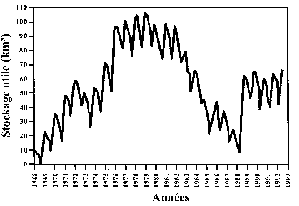 A cause des développements de l'eau, vastes et dramatiques, réalisés par l'ex-URSS dans le bassin de la Volga depuis les années 1930, la première étape d'une évaluation quelconque est de rendre l'écoulement conforme aux conditions naturelles pour éliminer les influences des activités humaines (Vali-Khodjeni, 1991). Mais pour les développements massifs de l'eau, le niveau actuel de -27,7 m serait revenu à celui élevé de -26,2 m de 1929 (Figure 2.12). Les pompages dans la Volga contribuent donc à réduire le niveau de la Caspienne de manière significative, quoique imprévisible, en empêchant ainsi des dommages plus sérieux aux régions irriguées et au développement urbain proche de la mer (dont la plupart ont été développés dans les dernières années). Il y a donc un renversement dramatique de la situation depuis les problèmes de l'abaissement du niveau de la mer à ceux d'une montée de son niveau et des moyens de contenir l'élévation des eaux contre les inondations.