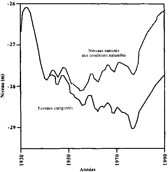 Figure 2.12. Niveaux enregistrés et niveaux ramenés aux conditions naturelles de la mer Caspienne (1930-1990) (d'après Vali-Khodjeni, 1991)