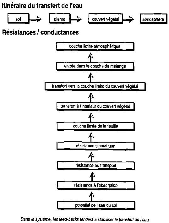 Un des aspects les plus complexes de l'estimation des modifications dans l'utilisation de l'eau par les cultures est l'extrapolation à partir des feuilles et du couvert au champ et à la région. Ceci est reconnu depuis longtemps par la communauté scientifique internationale et a poussé à la mise sur pied de campagnes de mesures à grande échelle (HAPEX: Hydrologic Atmospheric Pilot Experiment (Sahel et Espagne), GEWEX: Global Energy and Water Cycle Experiment (World Climate Research Programme)) et au démarrage du programme IGBP-BAHC (IGBP, 1993). Une grande partie des efforts devra aller au développement des modèles SVAT (Soil-Vegetation-Atmosphere-Transfer models). L'extrapolation du niveau stomatique et foliaire à la région a été le sujet d'études expérimentales et théoriques (McNaughton, 1994; McNaughton et Jarvis, 1991; Jacobs et de Bruin, 1992; Jacobs, 1994; Hollinger et al., 1994; Baldocchi, 1994a, b). En général, la structure du couvert végétal détermine dans une large mesure le transfert de chaleur et de vapeur d'eau dans la basse atmosphère. La plupart des modèles actuels négligent ou sursimplifient la réaction entre la végétation et la basse atmosphère, la couche limite planétaire (PBL: Planetary Boundary Layer). Dans une étude avec des modèles couplés (un modèle monodimensionnel pour la PBL couplé à un modèle "big-leaf Penman-Monteith modifié), Jacobs (1994) a montré que la sensibilité de la transpiration régionale aux changements de résistance de surface est réduite (à peu près de moitié) mais que la sensibilité aux modifications d'albédo croît entre 25 et 250% par rapport aux valeurs obtenues sans réaction de la PBL.