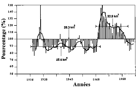 A cause des développements de l'eau, vastes et dramatiques, réalisés par l'ex-URSS dans le bassin de la Volga depuis les années 1930, la première étape d'une évaluation quelconque est de rendre l'écoulement conforme aux conditions naturelles pour éliminer les influences des activités humaines (Vali-Khodjeni, 1991). Mais pour les développements massifs de l'eau, le niveau actuel de -27,7 m serait revenu à celui élevé de -26,2 m de 1929 (Figure 2.12). Les pompages dans la Volga contribuent donc à réduire le niveau de la Caspienne de manière significative, quoique imprévisible, en empêchant ainsi des dommages plus sérieux aux régions irriguées et au développement urbain proche de la mer (dont la plupart ont été développés dans les dernières années). Il y a donc un renversement dramatique de la situation depuis les problèmes de l'abaissement du niveau de la mer à ceux d'une montée de son niveau et des moyens de contenir l'élévation des eaux contre les inondations.