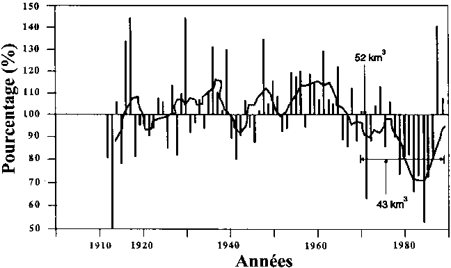 Dans la première approche, la variabilité naturelle du climat est utilisée pour prédire les tendances de précipitations pendant les séquences d'années extrêmement sèches ou humides. Des difficultés apparaissent à cause de la courte période d'enregistrements quoique les techniques de génération de données stochastiques peuvent être utilisées pour étendre la base de données. Cependant, sur des périodes de temps aussi limitées, des variations à long terme de la végétation, des températures de la surface des mers, des courants des océans, etc., auxquelles on pourrait s'attendre avec un doublement des contraintes atmosphériques tel que celui du CO2 ne sont pas prises en compte de façon adéquate. Indépendamment de cette limitation, des changements à long terme du ruissellement de surface ont eu lieu au cours des 30 dernières années dans un certain nombre de grands bassins versants, spécialement en Afrique. Récemment, une sérieuse évidence scientifique a aussi été produite pour suggérer que de tels changements sont directement liés au réchauffement global déclenché par l'augmentation de gaz anthropiques à effet de serre (Thomson, 1995; Hadley Centre, 1995). Alors que certaines tendances enregistrées dans l'écoulement des rivières sont du même ordre de grandeur que celui attendu dans un scénario de 2xCO2, un examen des changements récents dans le cycle hydrologique contribue à une compréhension des problèmes associés aux changements à long terme dans les ressources en eau en général (voir section 2.5. Changements récents dans le ruissellement global).