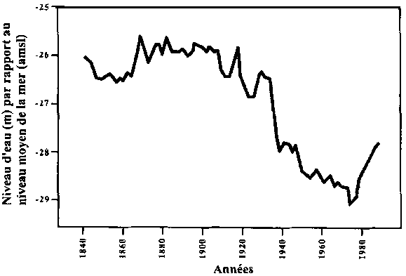 La consommation relative d'eau à venir a été compilée et les prévisions sont basées sur la construction des canaux d'irrigation Volga-Don et Volga-Chograi (Tableau 2.7, Berezner, 1987). Pour des prélèvements de 37 km3 et un débit résiduel de 266 km³/an, la mer Caspienne est en équilibre autour de -28,5 mètres sous le niveau des mers. Ce niveau est considéré comme à peu près optimum pour les pêcheries. Au cours du dernier millénaire, on pense que le niveau le plus élevé de -22 m a été atteint au 17ème siècle et les plus bas, -31 m au 15ème et -29 m en 1977, soit une gamme de 9 mètres (Figure 2.11).