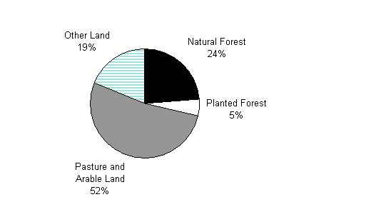 Nonetheless, as Figure 1 shows, more than 50 percent of the land remains in agricultural and pastoral uses. The closed natural forests, a reasonable proportion of which are virgin forest, cover 23 percent of the land, including particularly large tracts in the west and south of the South Island. The planted forests presently cover around 5 percent of land, and "Other Land"; including urban land, mountains, scrublands and other non-pastoral wooded or grass lands, rivers, lakes and swamps; makes up the balance.