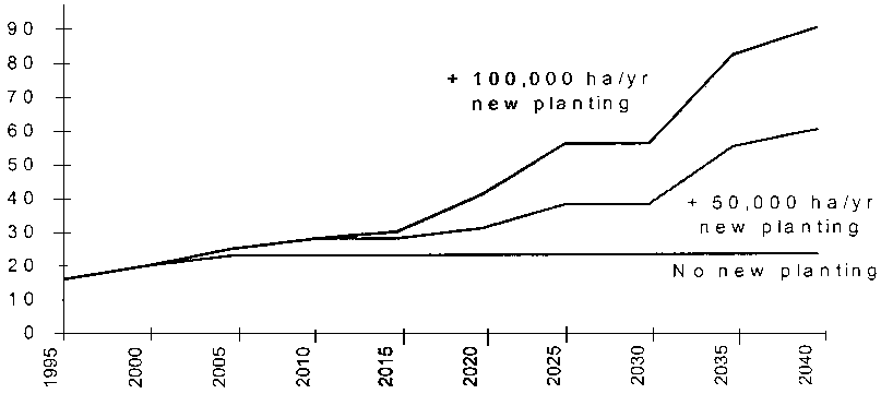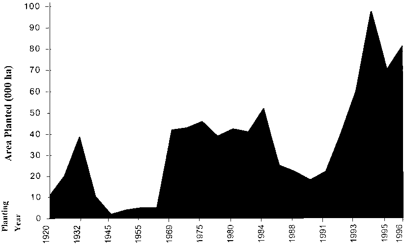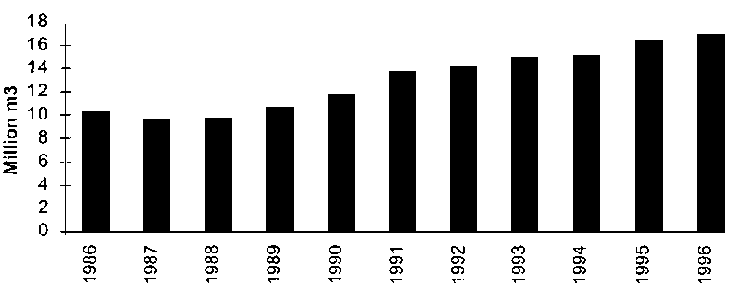 · Annual harvest expanded to 16.4 million m3 in 1995 (up 9 percent from 1994) and grew by a further 3 percent to 16.9 million m3 in 1996.· In 1995 new plantings where 71 000 ha, with a 14 percent increase to 81 000 ha in 1996 (last four-year average has been 75 000 ha annually).