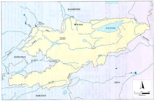 The Kyrgyz Republic is a landlocked country in Central Asia with a total area of 198 500 km2. It is bordered in the north by Kazakhstan, in the east and southeast by China, in the southwest by Tajikistan and in the west by Uzbekistan. It became independent from the Soviet Union in August 1991. The country is divided into six provinces (oblasts).