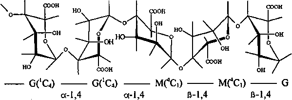 The number and sequence of the Mannuronate and Glucuronate residues shown above vary in the naturally occurring alginate. The associated water molecules are not shown. |