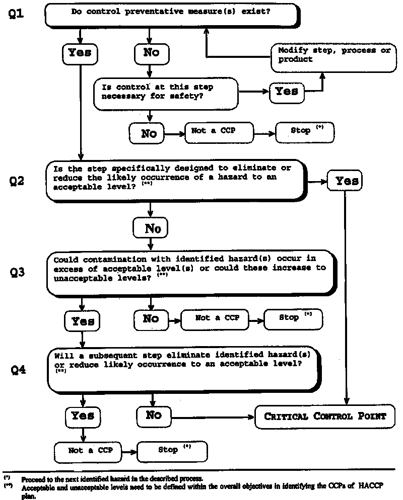 There may be more than one CCP at which control is applied to address the same hazard. The determination of a CCP in the HACCP system can be facilitated by the application of a decision tree (e.g. Diagram 2), which indicates a logic reasoning approach. Application of a decision tree should be flexible, given whether the operation is for production, slaughter, processing, storage, distribution or other. It should be used for guidance when determining CCPs. This example of a decision tree may not be applicable to all situations. Other approaches may be used. Training in the application of the decision tree is recommended.