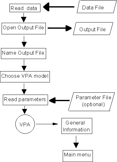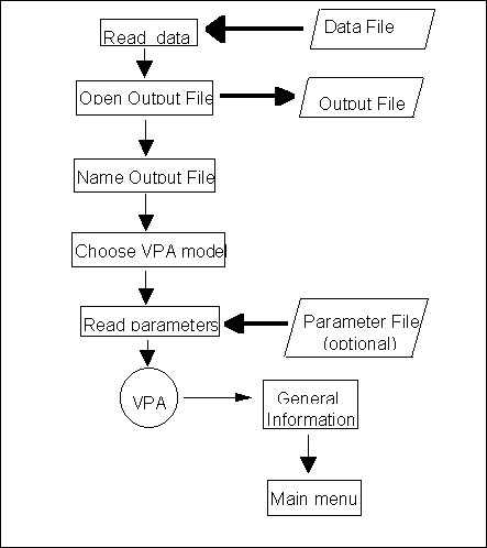 All options, except for the first one, are interactive. The first two only give information to the user. Options 3 and 4 allow for parameter modification. Options 4, 5, 6 and 7 conduct analyses whose results are written into the output file. Option 8 creates new parameter and data files, and option 9 (hidden) allows modification of the precision of VPA calculations.