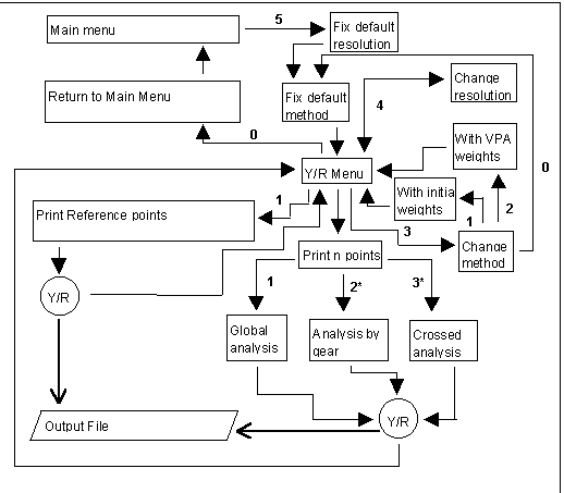 From this menu all options can be accessed, and once these are completed the program returns to it. Option 0 is used to stop program execution and return to the operating system. It is possible to return to this menu from any of the options by selecting 0, except in cases where this return happens automatically after the execution of the option. See menu descriptions in each case.