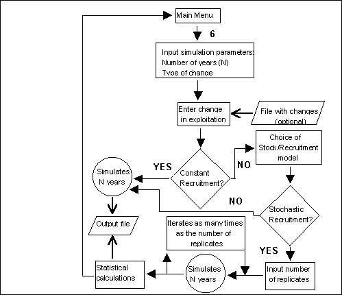 The program also creates a new parameter file derived from the parameter values kept in memory at the time we selected this option. It has to be remembered that the parameter values can be modified during program execution (sections 3.4.3 and 3.4.4.2). The only parameters that require adapting to the new class structure are: the terminal fishing mortality (Fterm), and obviously the proportion mature per class. The other parameters do not require any modification. In section 5.10 we show the method employed to transform sizes to ages and how parameters are modified.