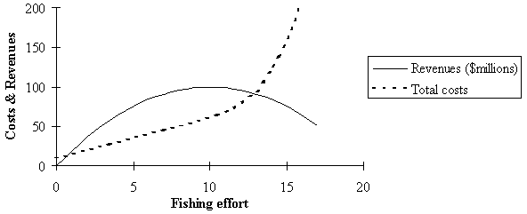 Figure 6: Changes in the total cost of fishing with fishing effort together with changes in revenues. Note that total costs increase rapidly at higher fishing effort levels as indirect costs (such as costs related to overfishing or environmental risk) become more important than direct operational costs. The precise form of the revenue and total costs relationships will vary with individual fisheries but should follow the same general functions as those above.