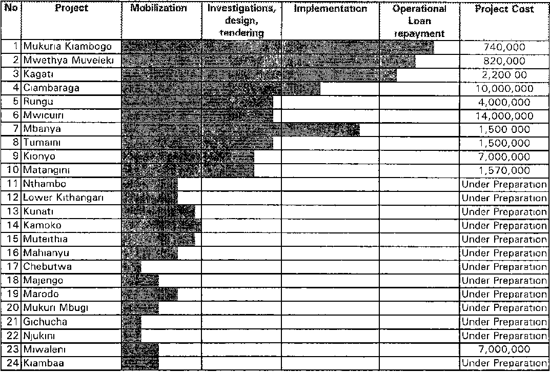 · Mwicuiri project in Karatina region is in the final stage of raising the security fund. Surveys, designs and tendering have been finalized and a contractor identified. Construction is due to commence in April, 1997.· Ruungu project in Meru region is being implemented.