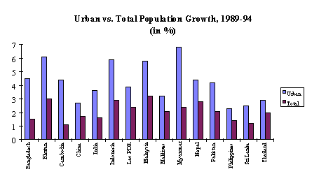Urbanization is basically the growth in urban population, which always tends to be higher than total population growth. The urban areas attract people from the rural areas because of generally better income opportunities and higher standard of living that comes with higher income. In eight RWEDP member countries, urban population is growing at least twice faster than total population (Figure 4.8). Despite this trend, urban population comprises only at most one-third of the total population in these countries (Figure 4.9).