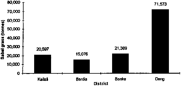 Figure 2: Estimate of annual production of sabai grass (tonnes) in four selected districts