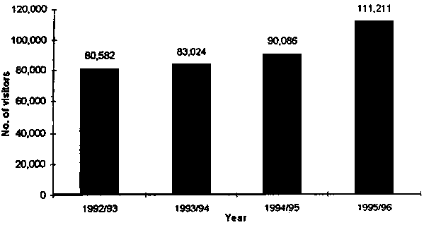 Recently investment in ecotourism has been extended to other protected areas as well. The protected areas earn significant tourist revenues in Nepal. In 1995/96 the Department of National Parks and Wildlife Conservation earned US$ 1.16 million from ecotourism related activities (DNPWC, 1996). More than 111,000 tourists (Nepali as well as foreigners) visited the National Parks and Wildlife Reserves in 1995/96. The number of visitors to these areas have been increasing in recent years (Figure 3).